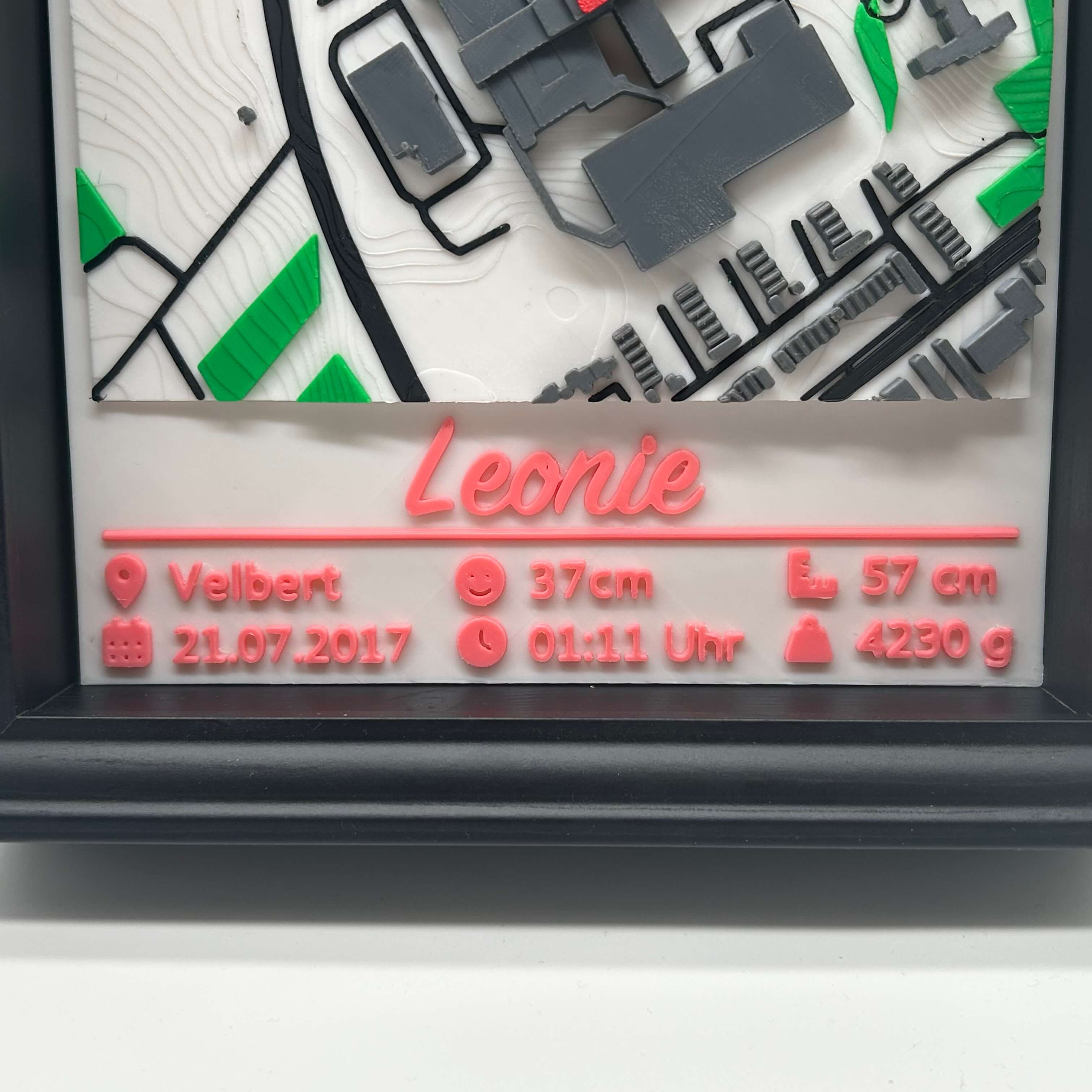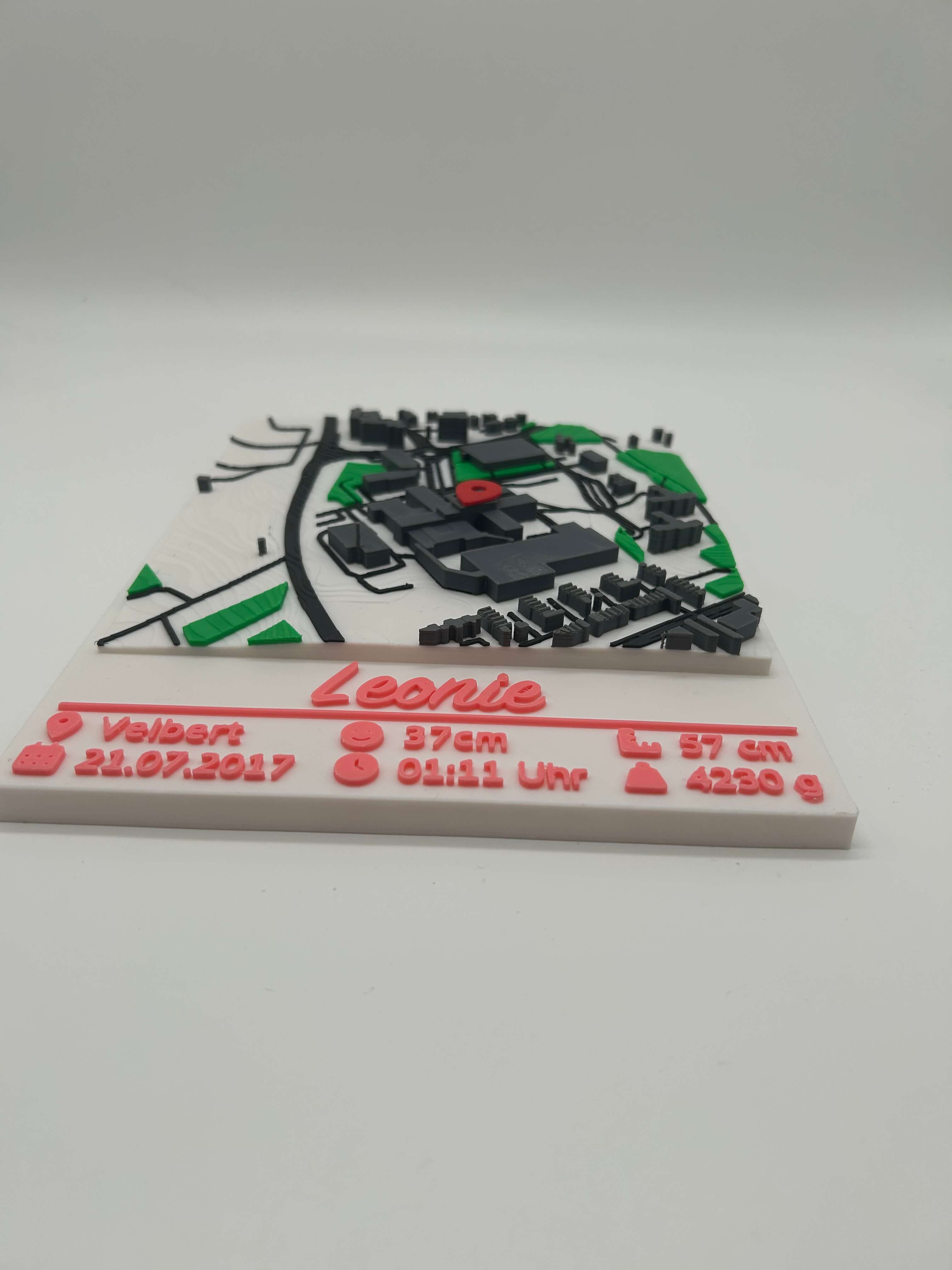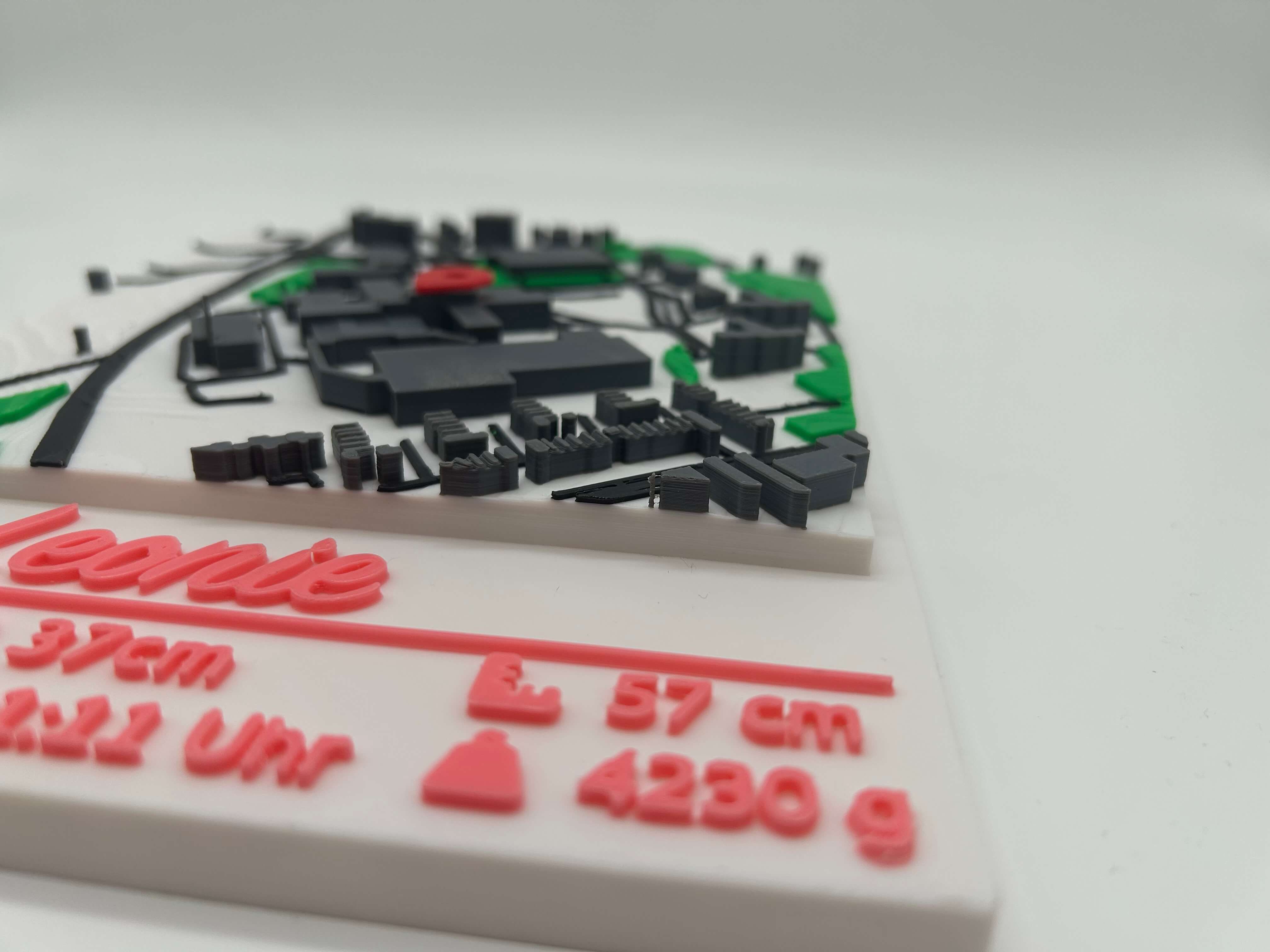 Ein emotionales Erinnerungsstück zur Geburt: 3D-Stadtkarte vom Geburtsort mit Name und allen wichtigen Geburtsdaten – Datum, Uhrzeit, Größe, Gewicht, Kopfumfang. Die Farbe der Personalisierung wählst du selbst aus.