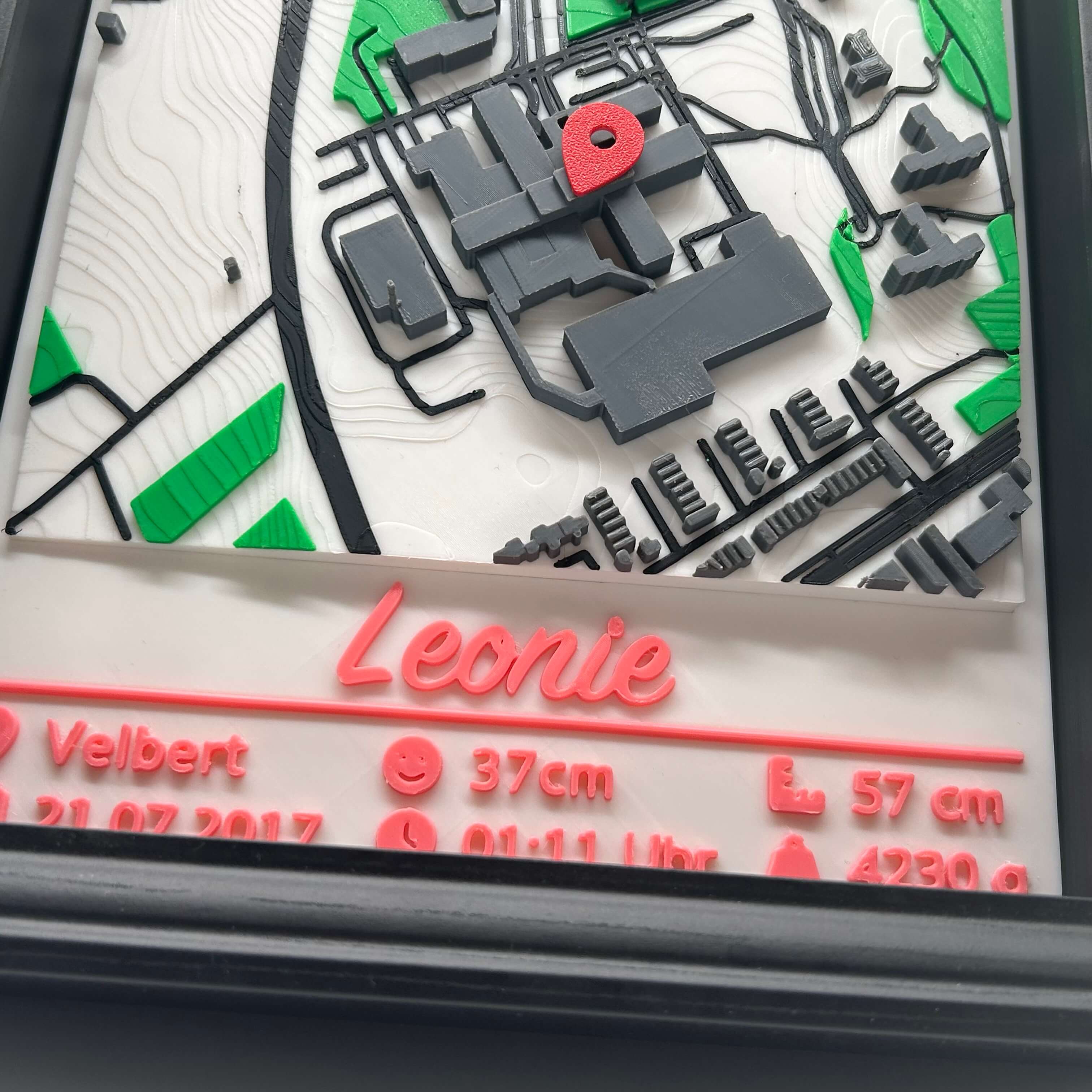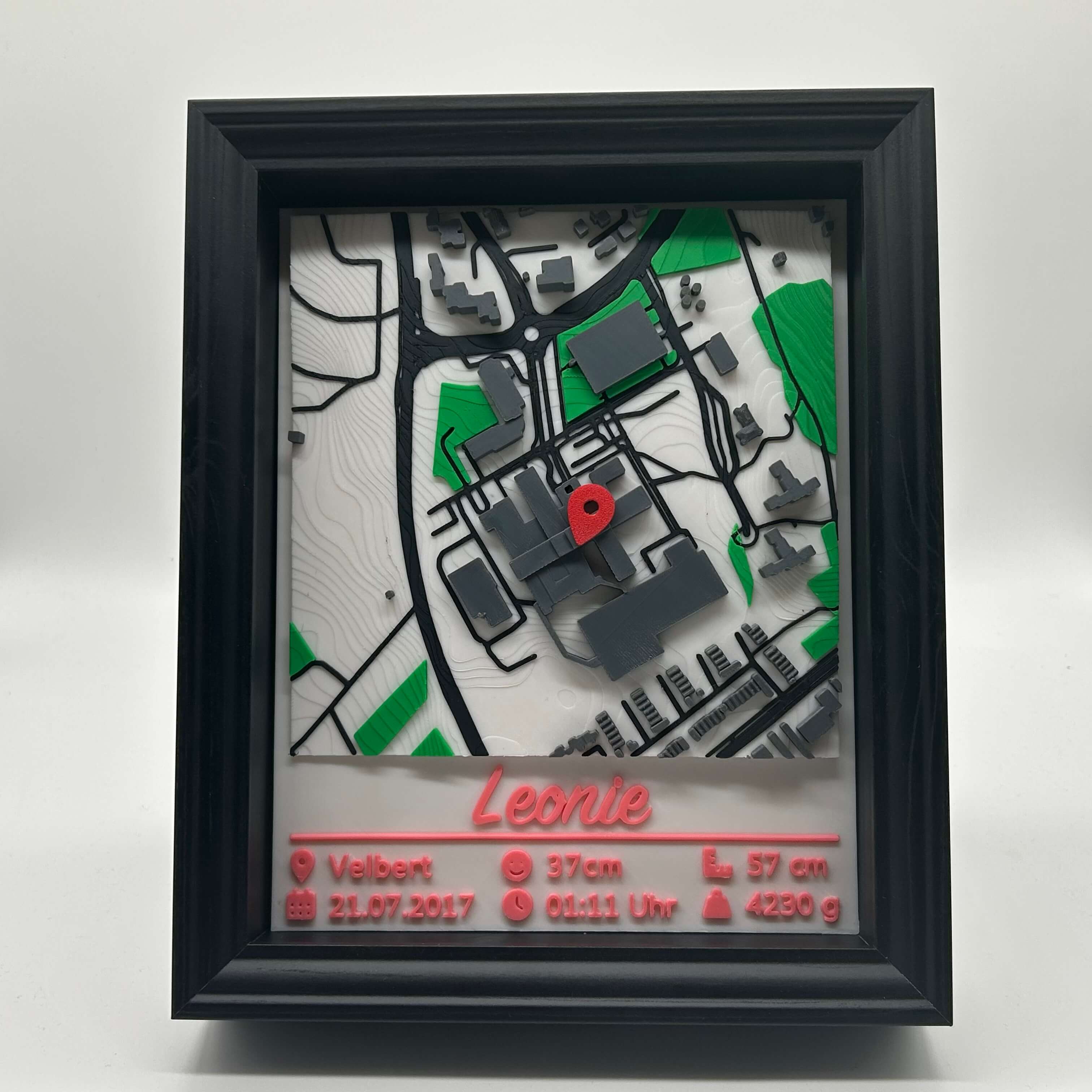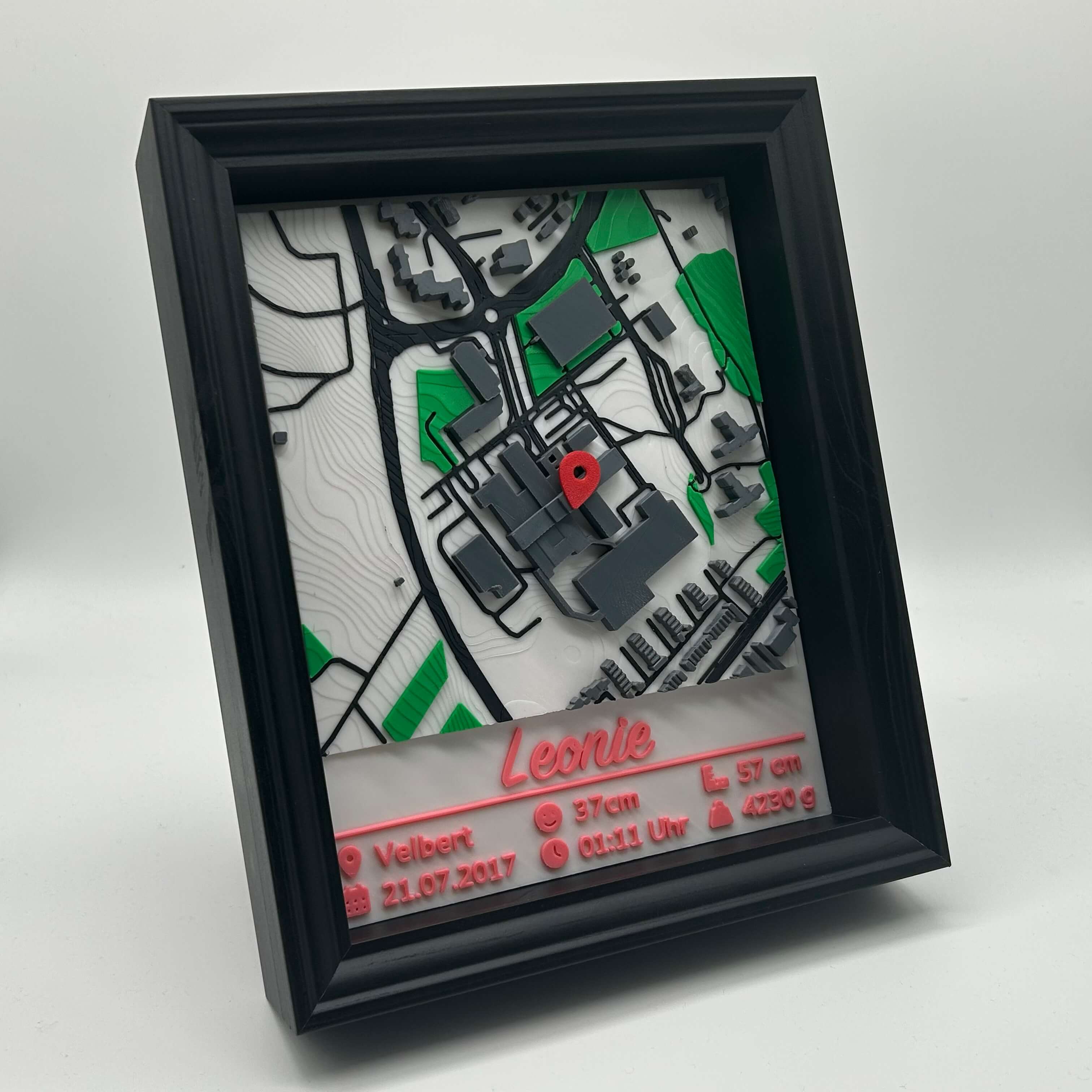 Ein emotionales Erinnerungsstück zur Geburt: 3D-Stadtkarte vom Geburtsort mit Name und allen wichtigen Geburtsdaten – Datum, Uhrzeit, Größe, Gewicht, Kopfumfang. Die Farbe der Personalisierung wählst du selbst aus.