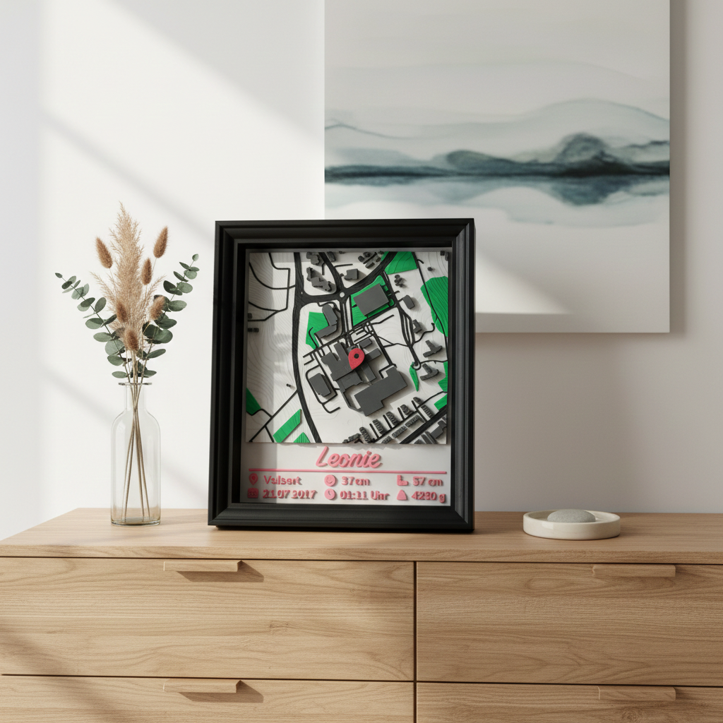 Dieses personalisierte Geburtsgeschenk hält einen der wichtigsten Momente für immer fest: Der Geburtsort wird als 3D-Relief-Stadtkarte dargestellt und mit den individuellen Daten deines Babys kombiniert. So entsteht ein modernes, stilvolles Wand- oder Regal-Highlight, das Eltern lange begleitet.
