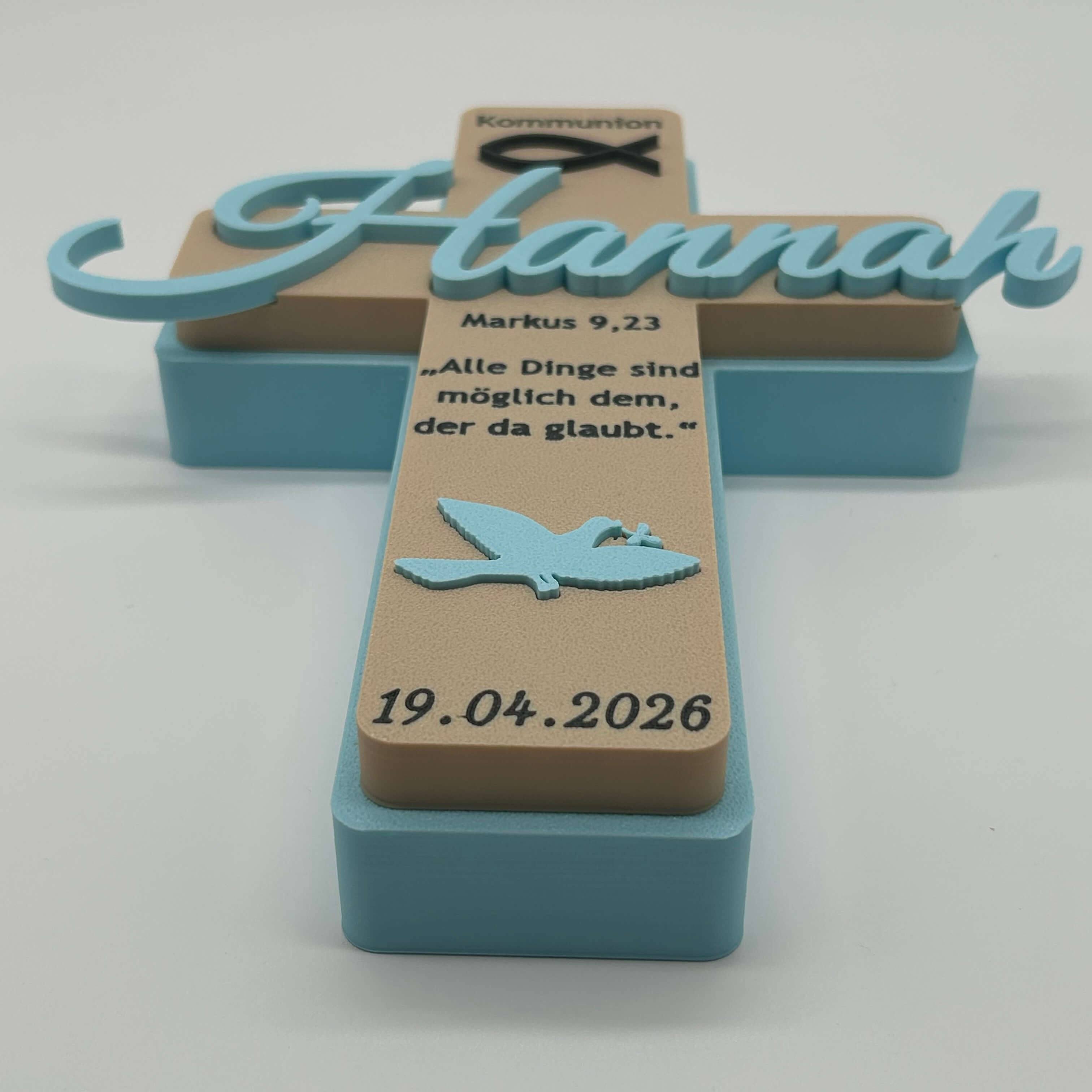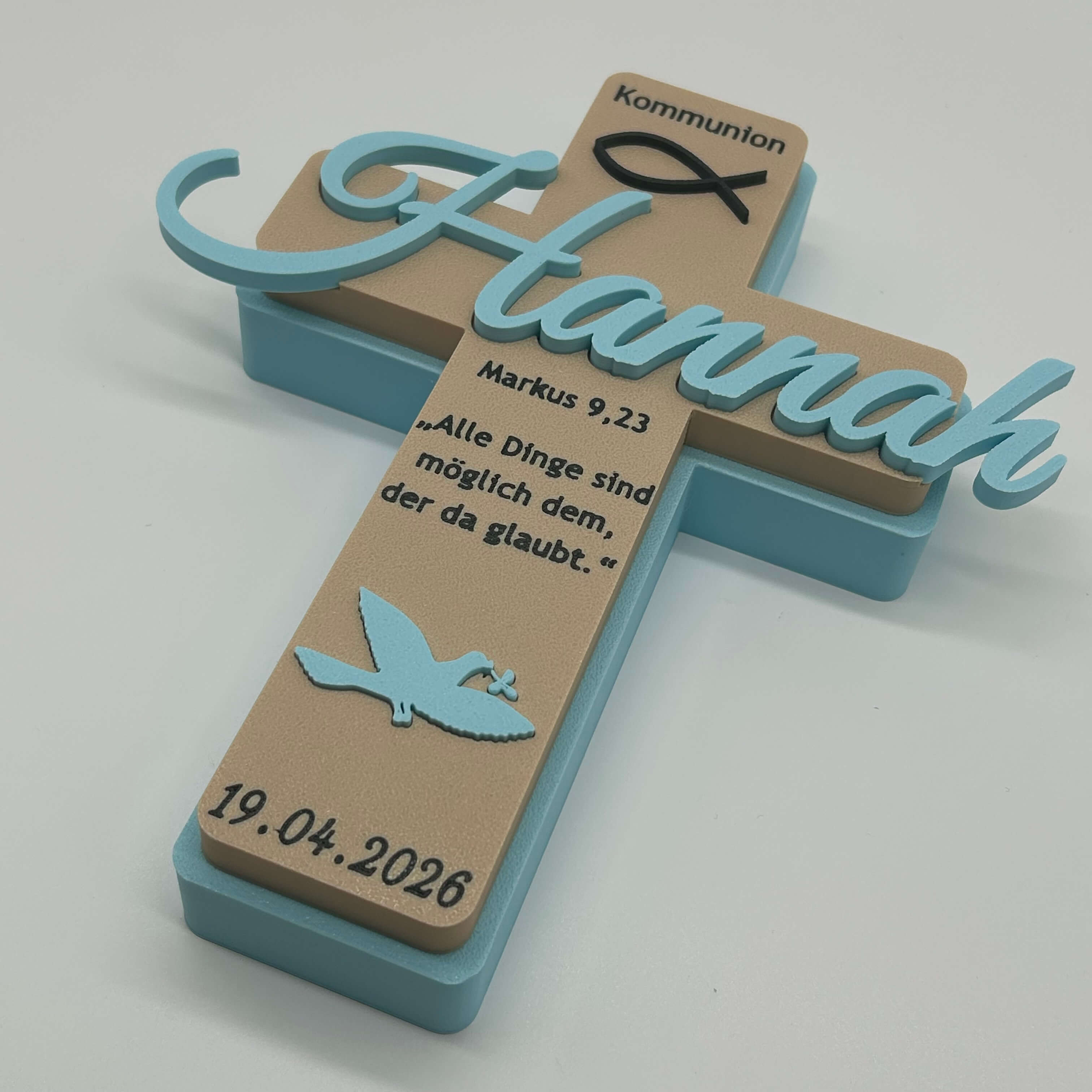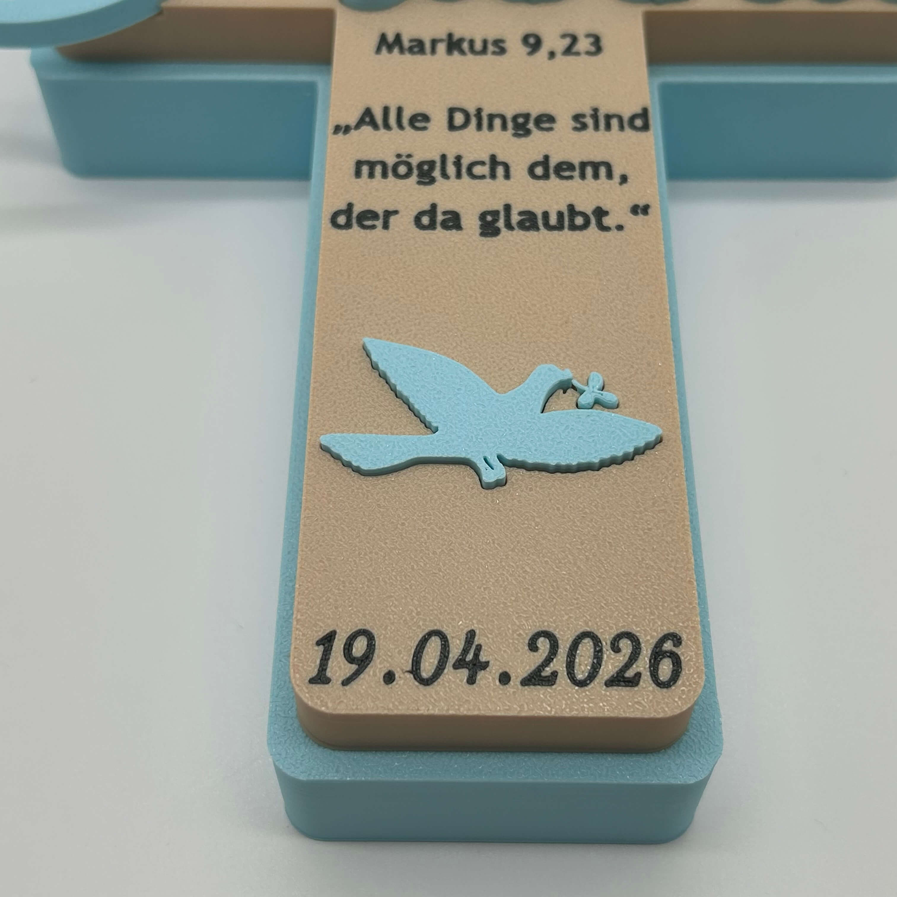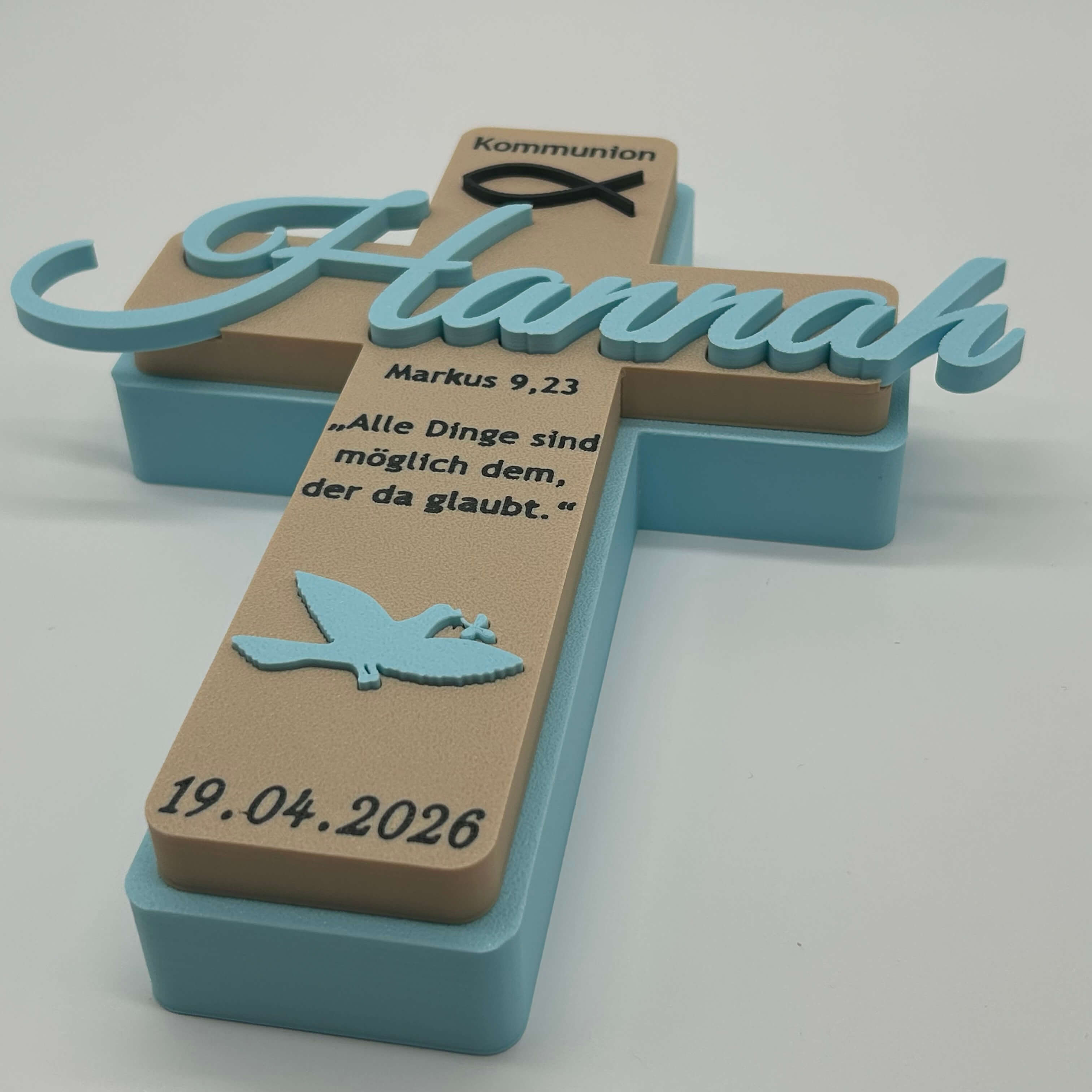 Der ausgewählte Vers macht das Kreuz noch persönlicher und verleiht dem Geschenk eine emotionale und christliche Bedeutung. Über die Farbauswahl kannst du das Design passend zum Anlass gestalten. So entsteht ein Kommunion Geschenk, das zeitlos, individuell und wertvoll wirkt.