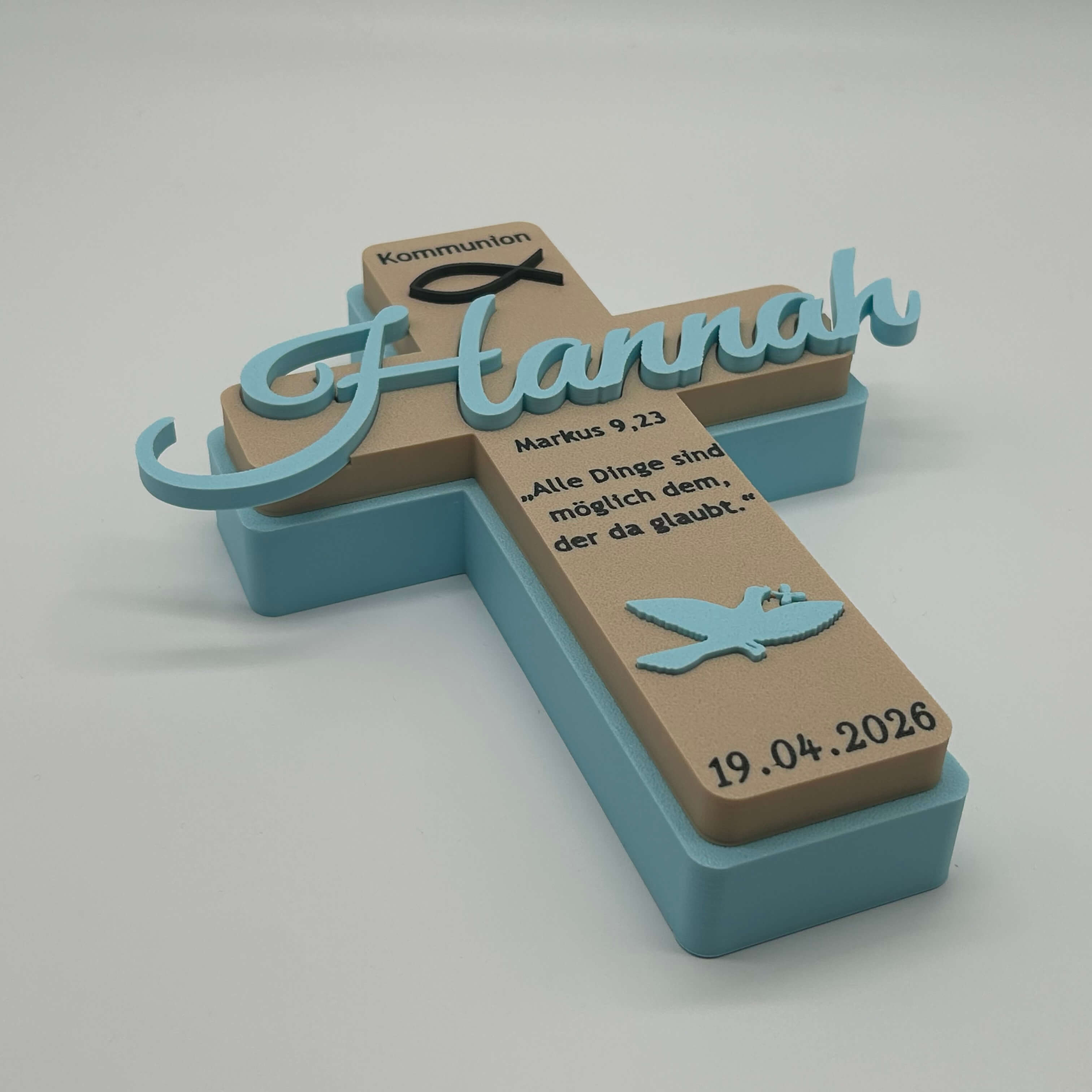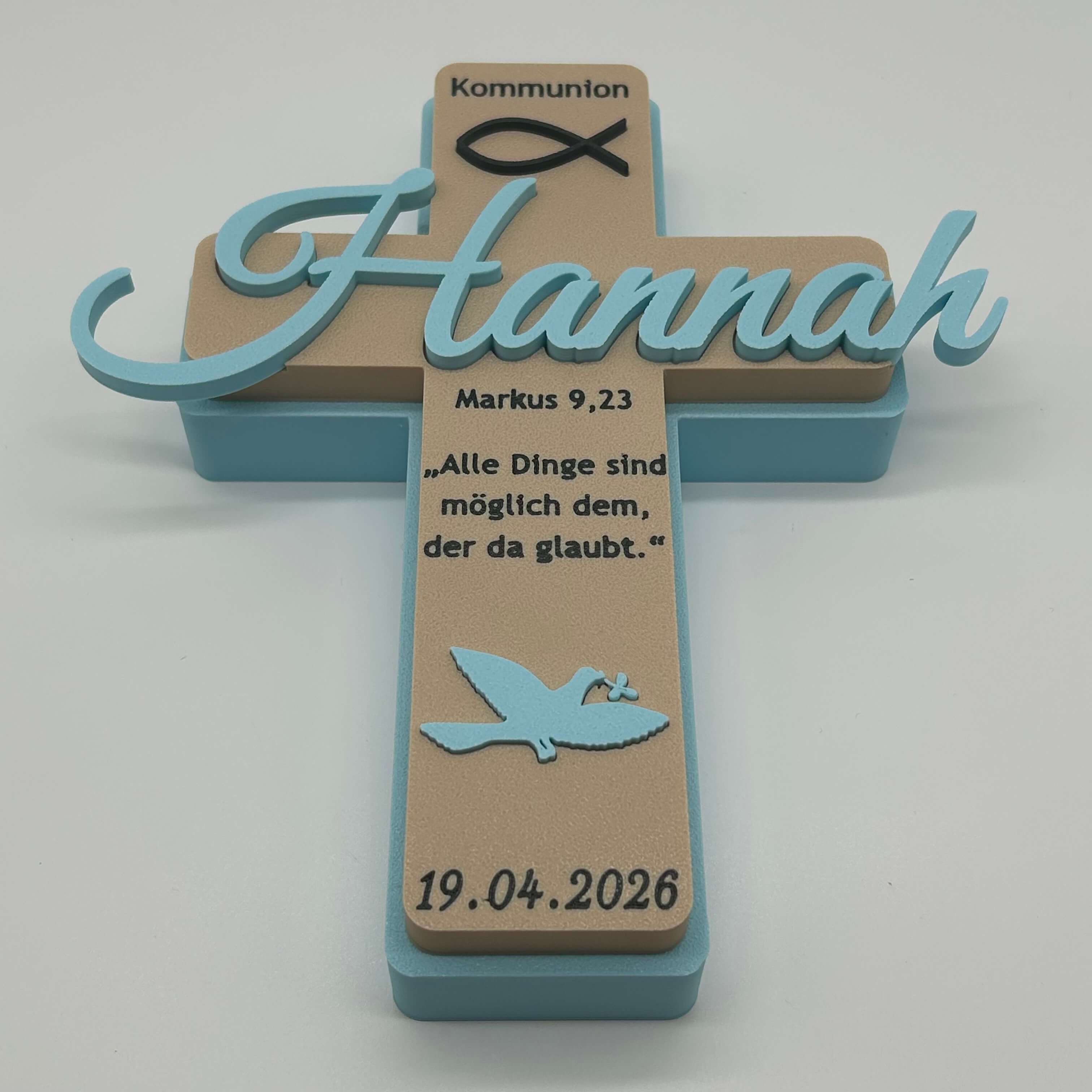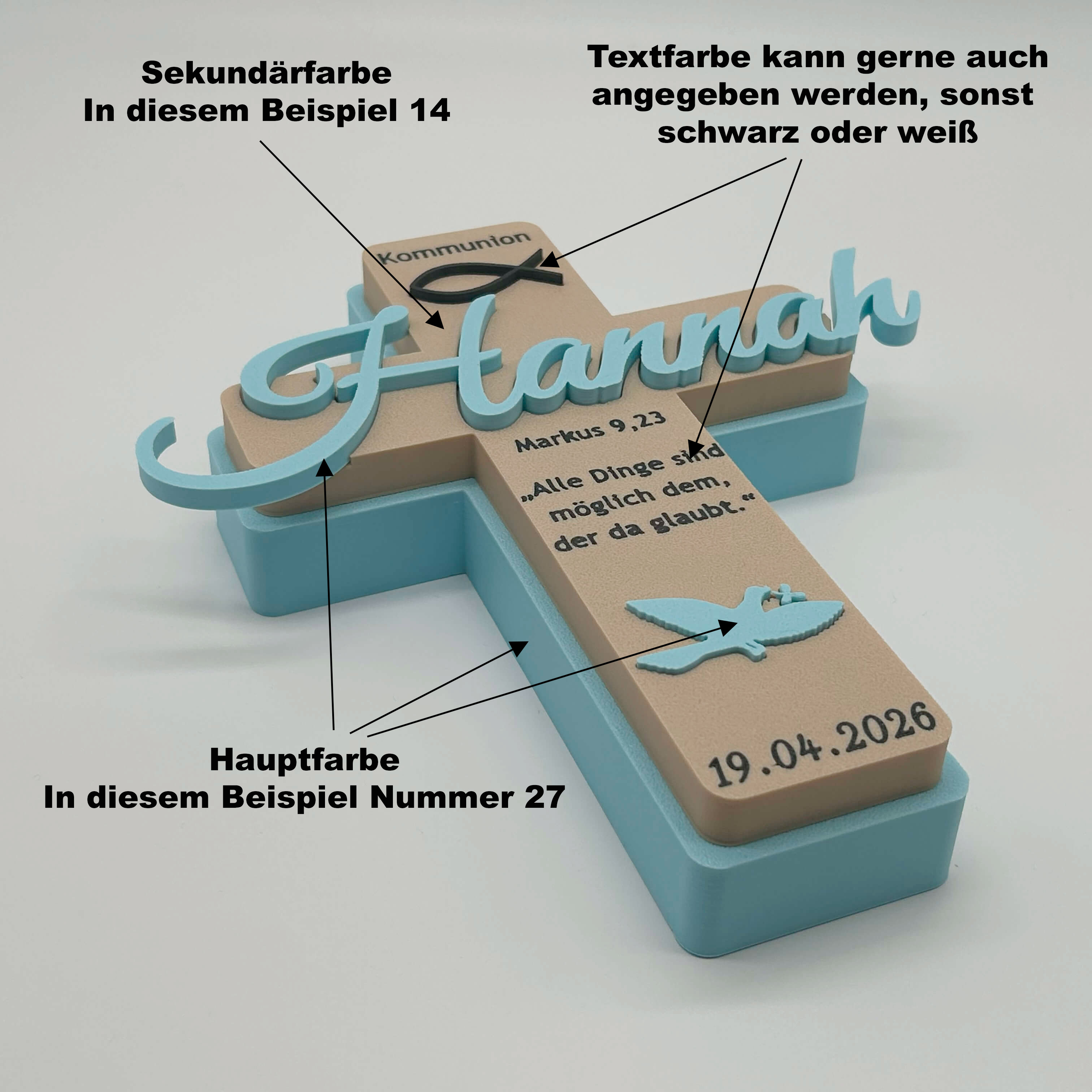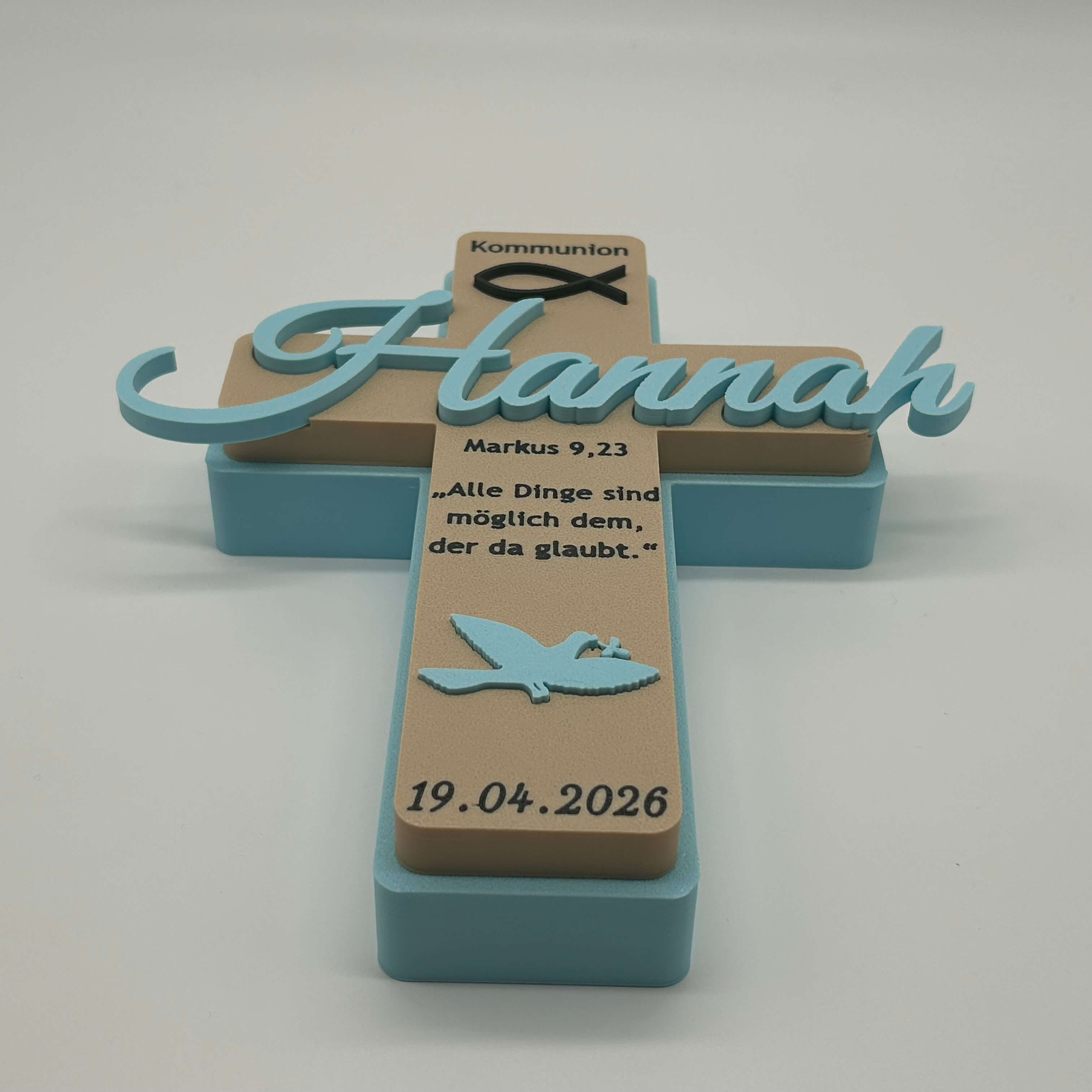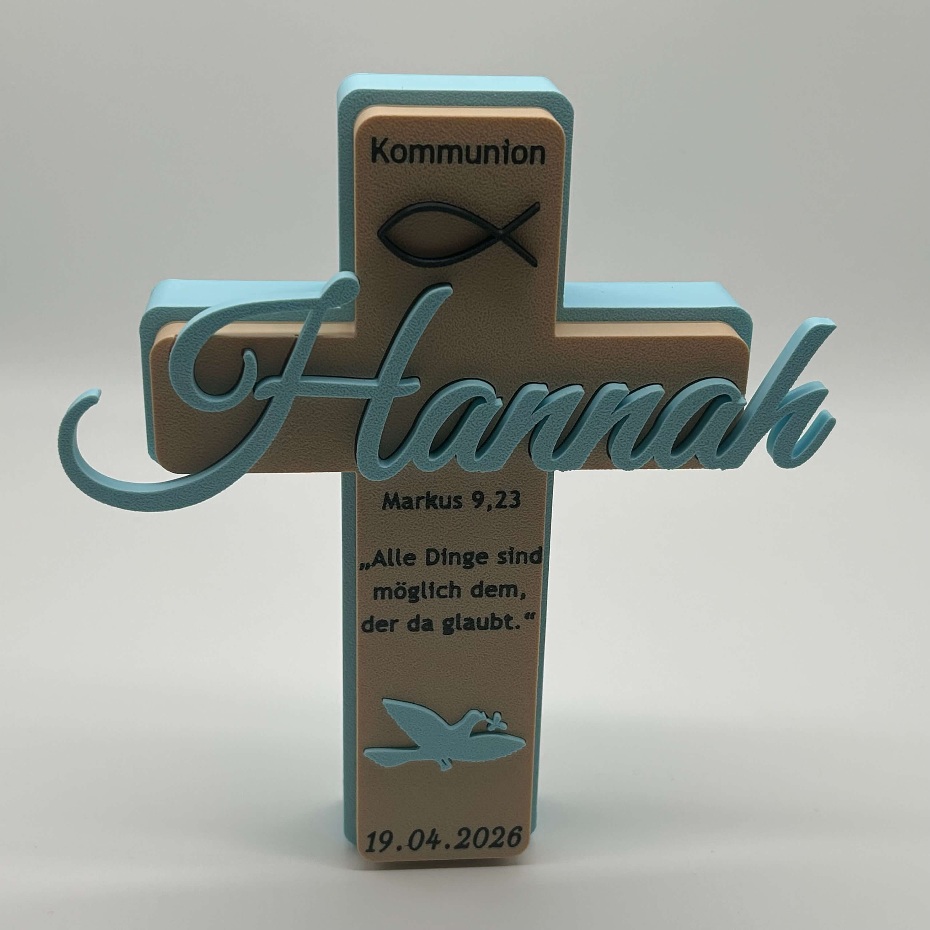 Der ausgewählte Vers macht das Kreuz noch persönlicher und verleiht dem Geschenk eine emotionale und christliche Bedeutung. Über die Farbauswahl kannst du das Design passend zum Anlass gestalten. So entsteht ein Kommunion Geschenk, das zeitlos, individuell und wertvoll wirkt.