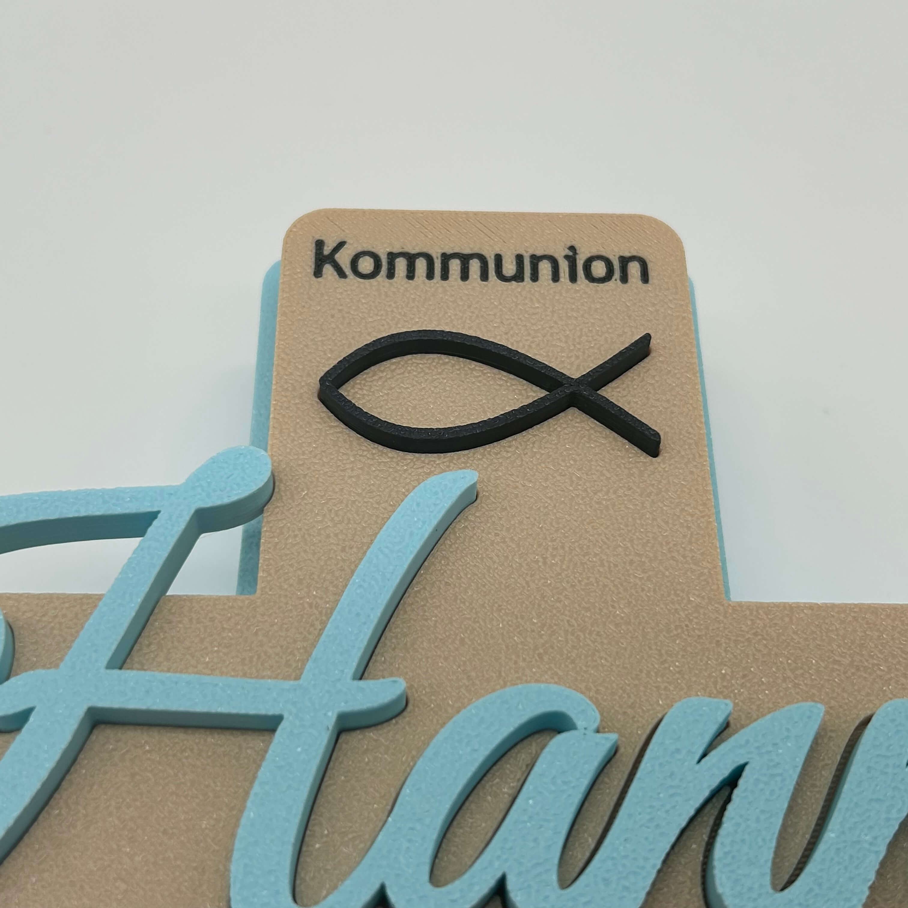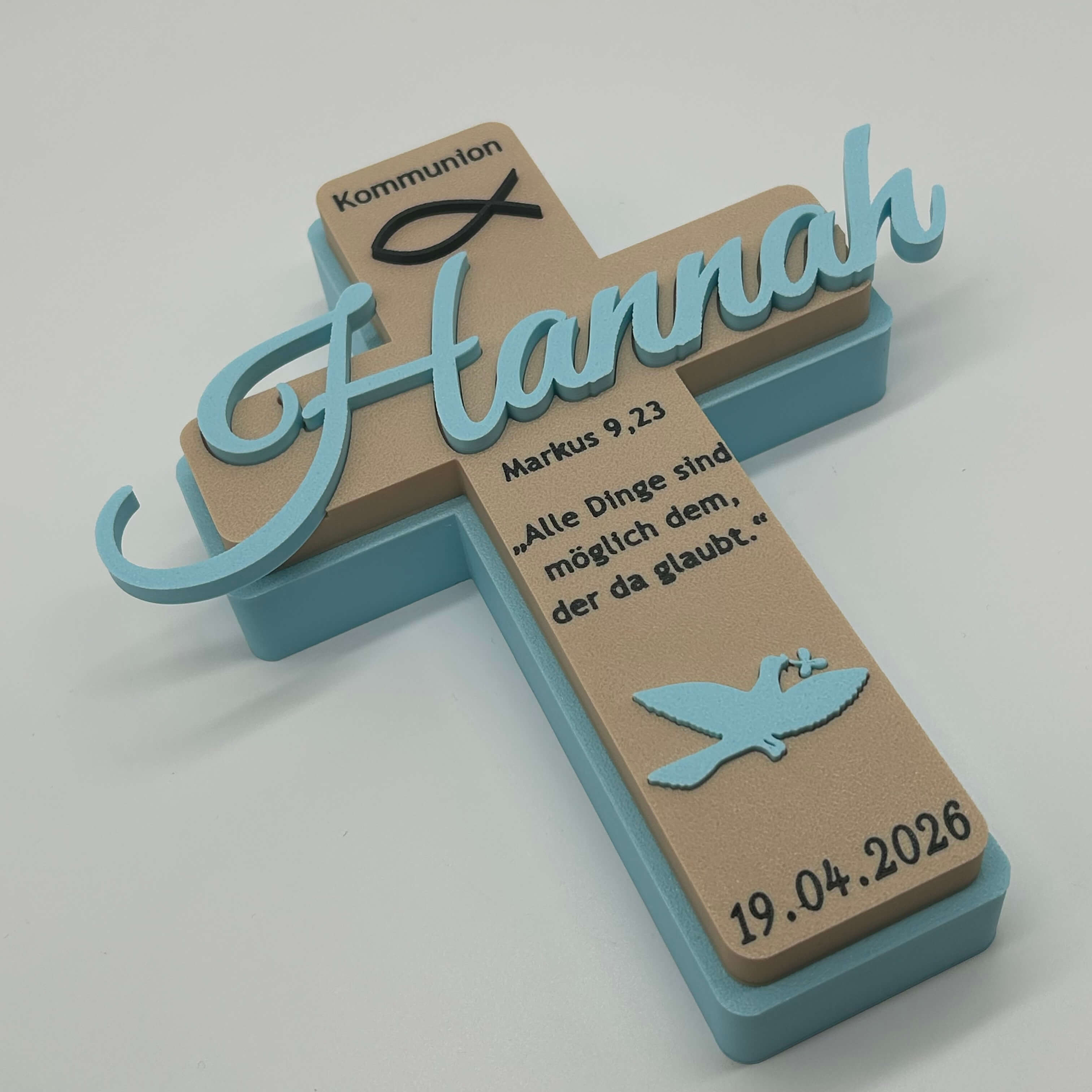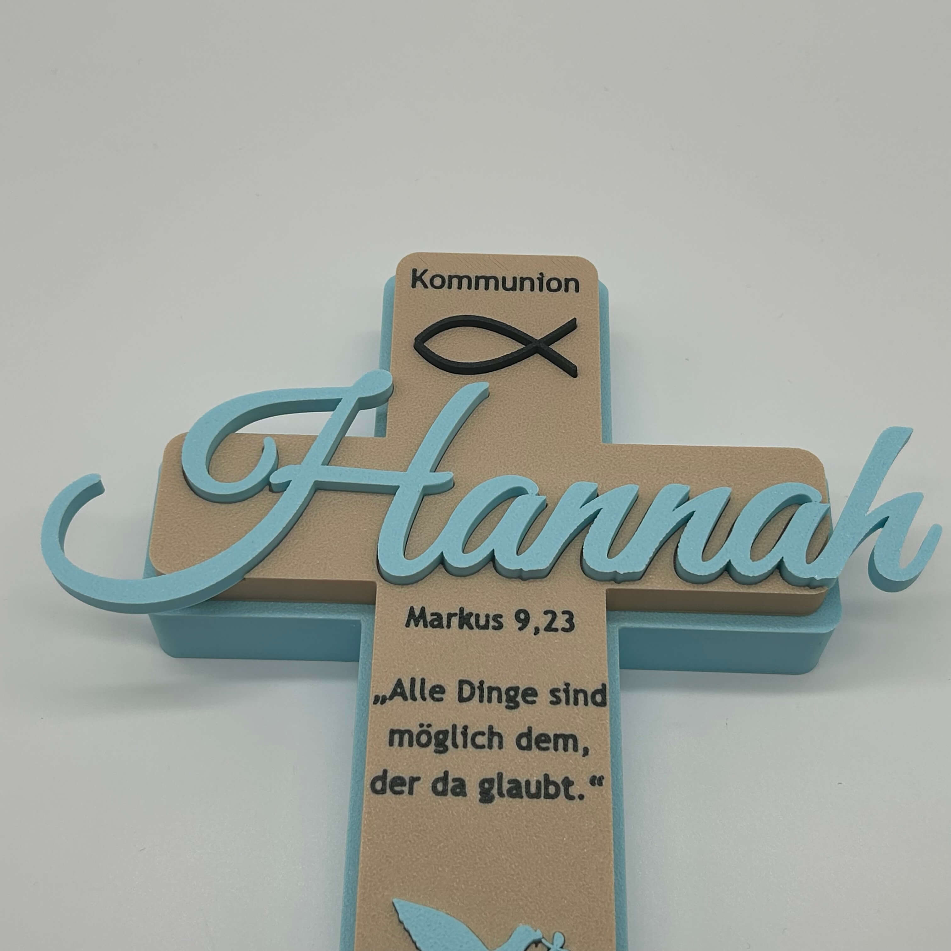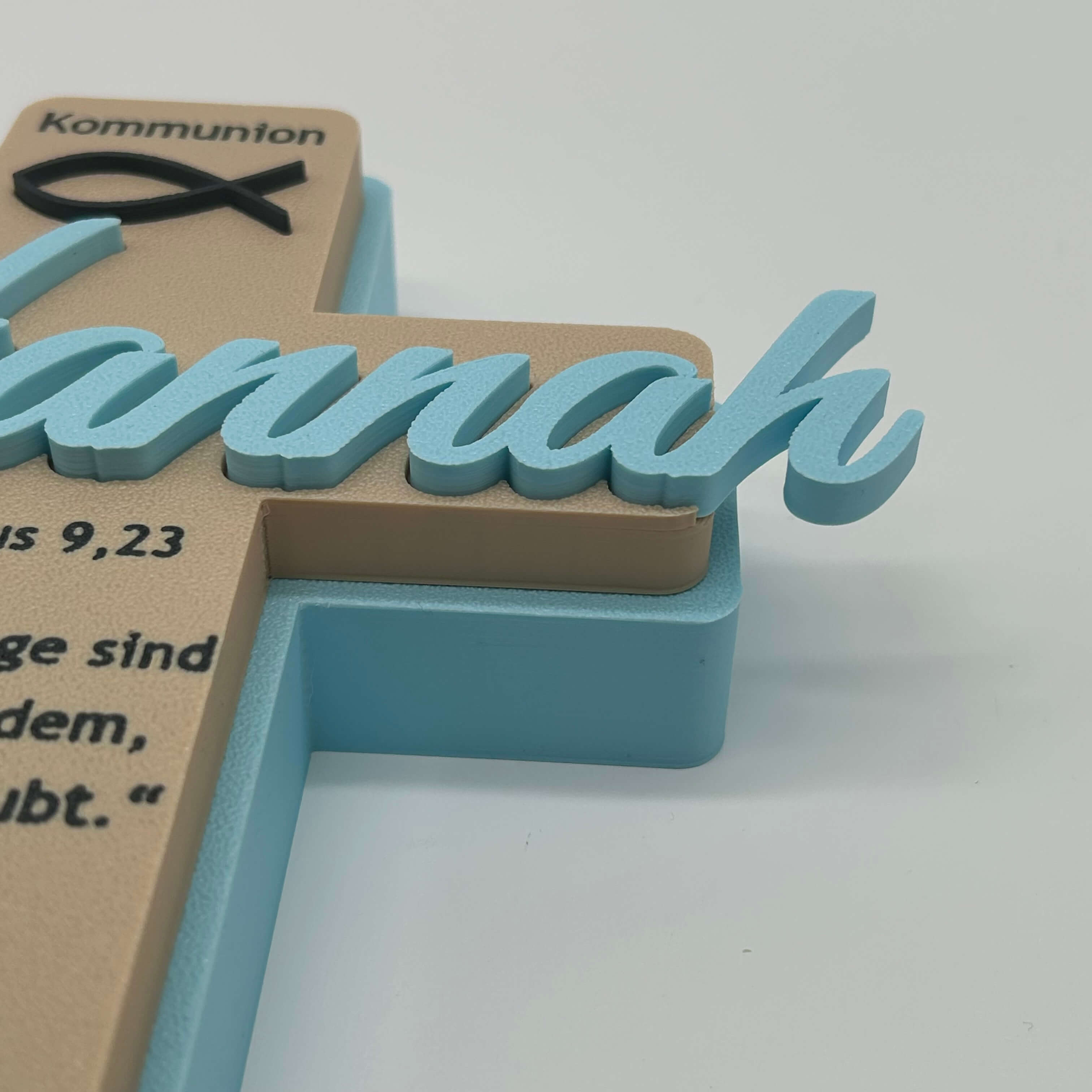 Der ausgewählte Vers macht das Kreuz noch persönlicher und verleiht dem Geschenk eine emotionale und christliche Bedeutung. Über die Farbauswahl kannst du das Design passend zum Anlass gestalten. So entsteht ein Kommunion Geschenk, das zeitlos, individuell und wertvoll wirkt.