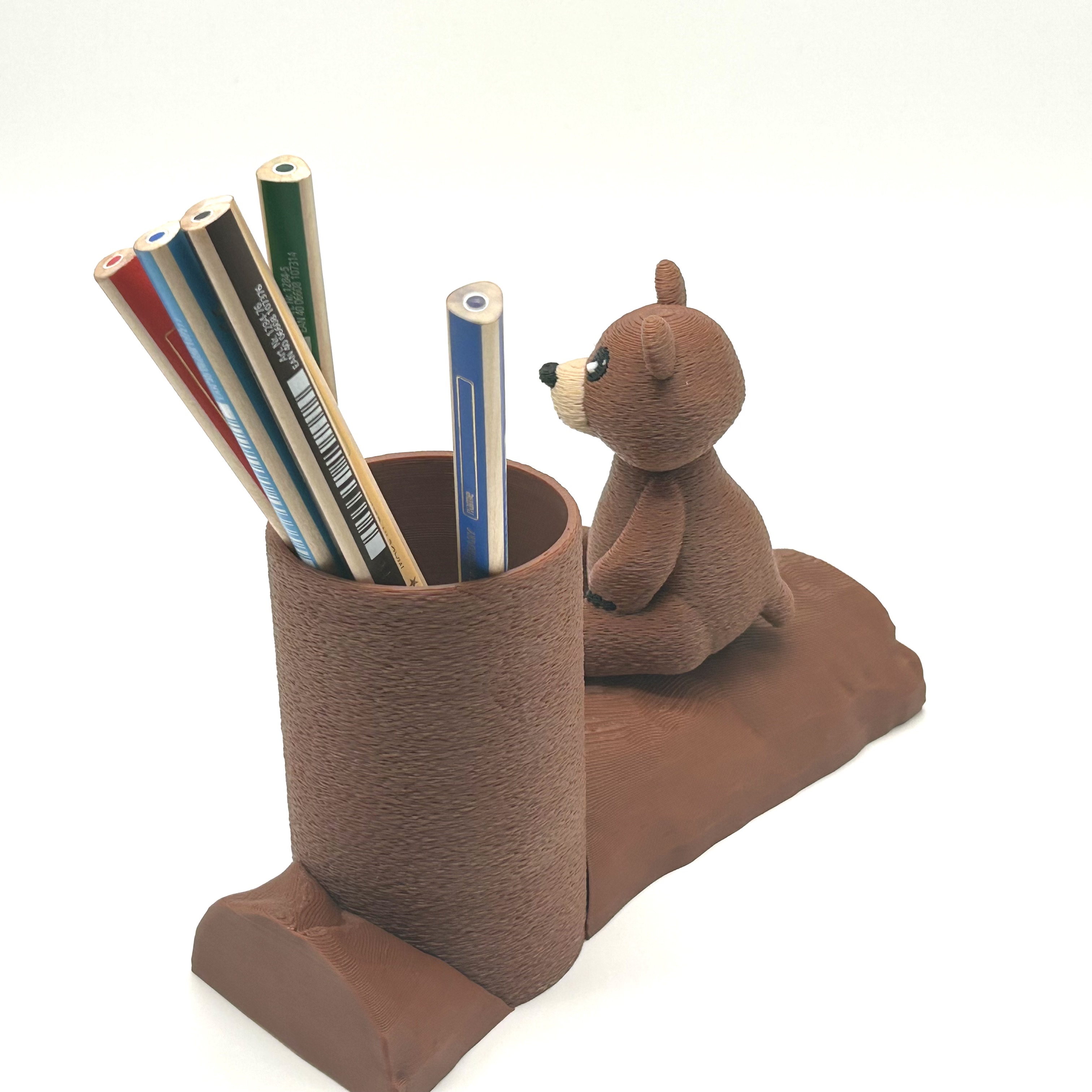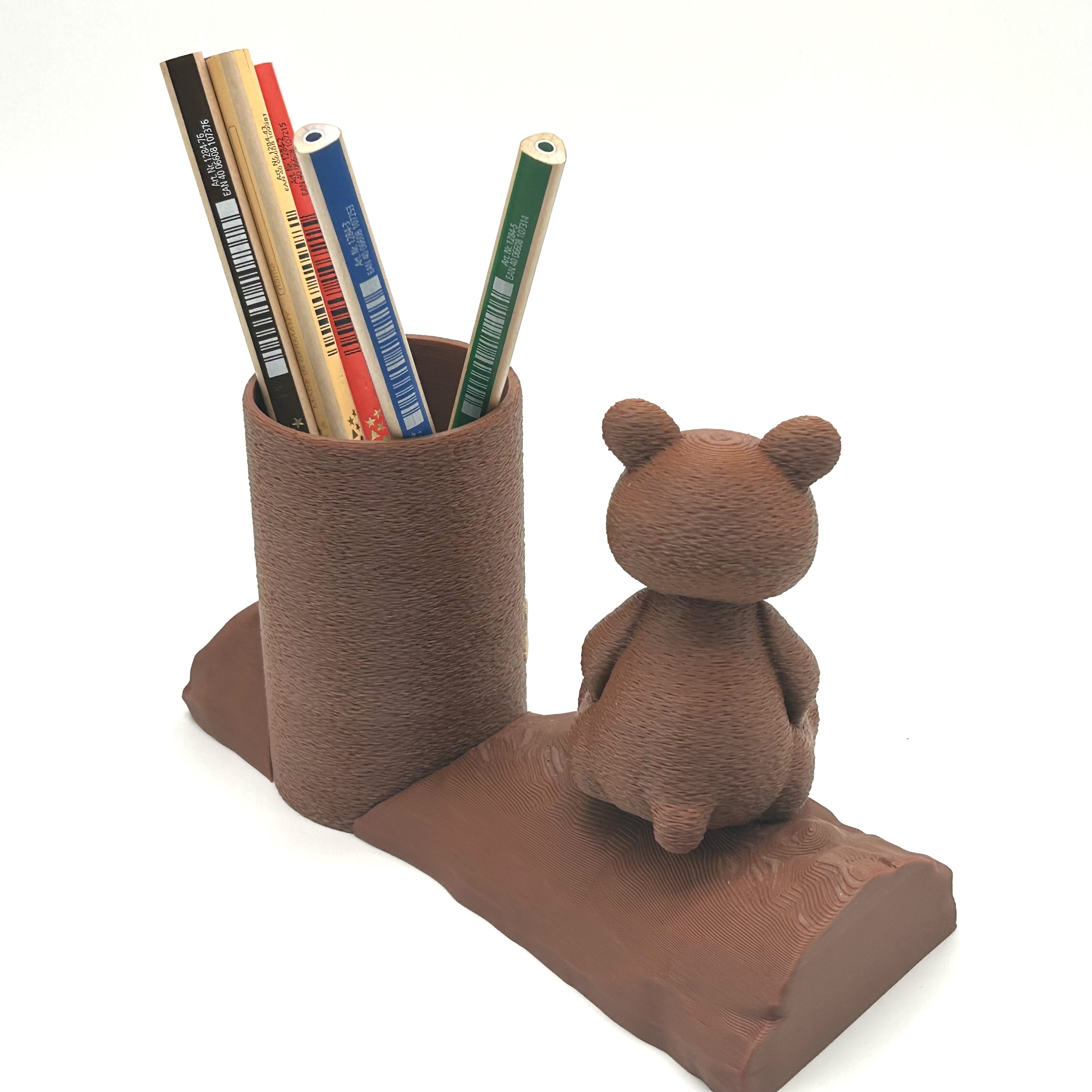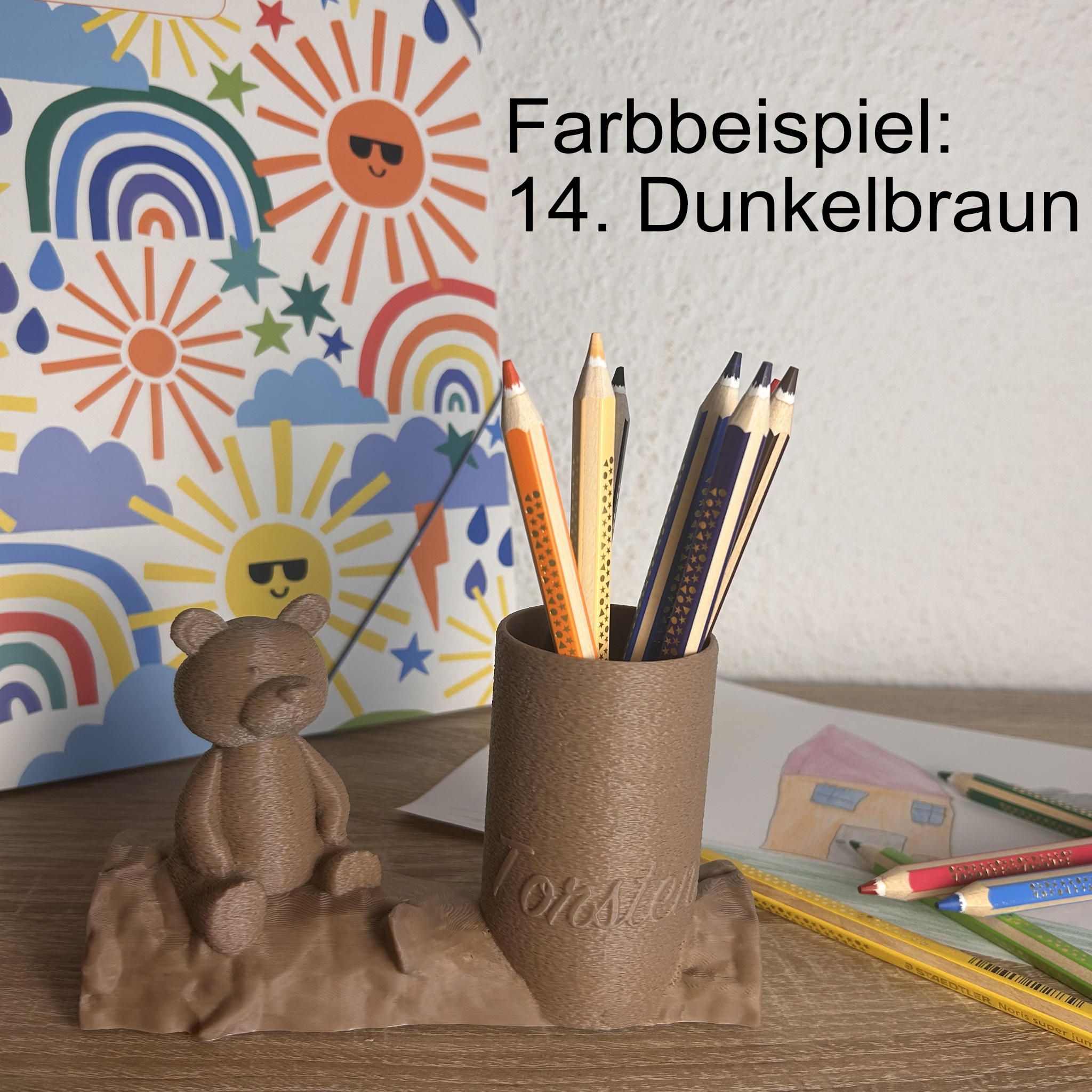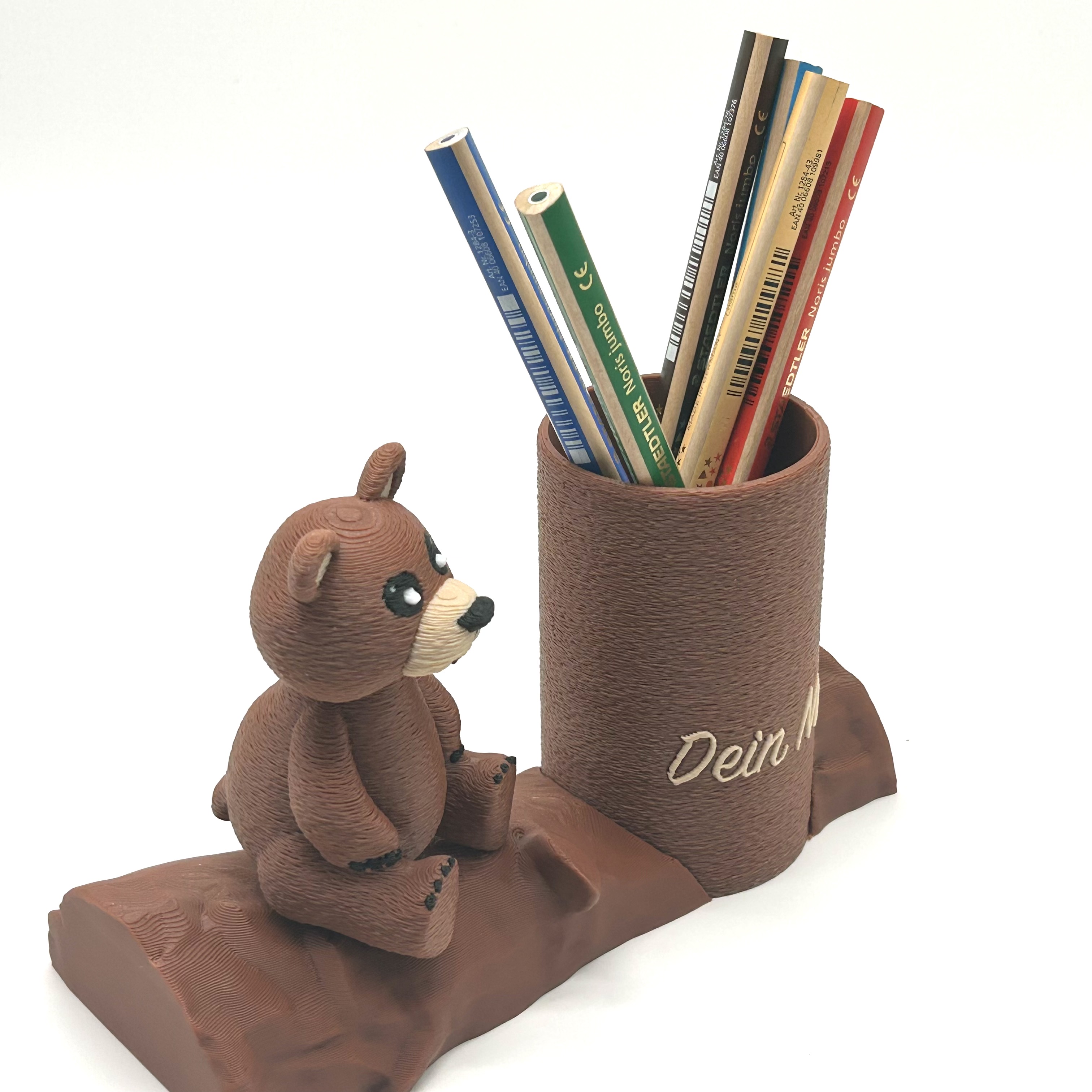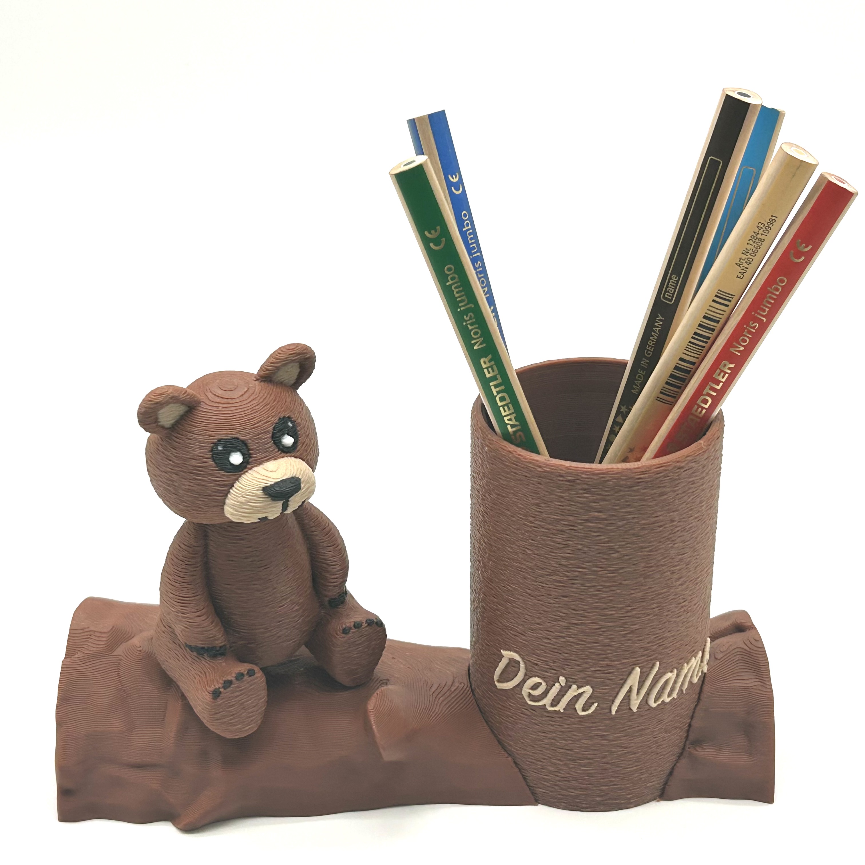 Gemütlicher Blickfang für den Schreibtisch: Der 3D-Stiftehalter im Bär-Design aus PLA ordnet Bunt- und Filzstifte, Marker oder eine Schere. Auf Wunsch mit Wunschnamen personalisiert und in vielen Farben erhältlich – inklusive Multicolor.